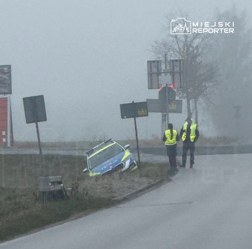 At about 3 p.m. on Highway 62 near Cieśle, Poland, a police patrol vehicle lost control and slid into a roadside ditch, but no one was injured.