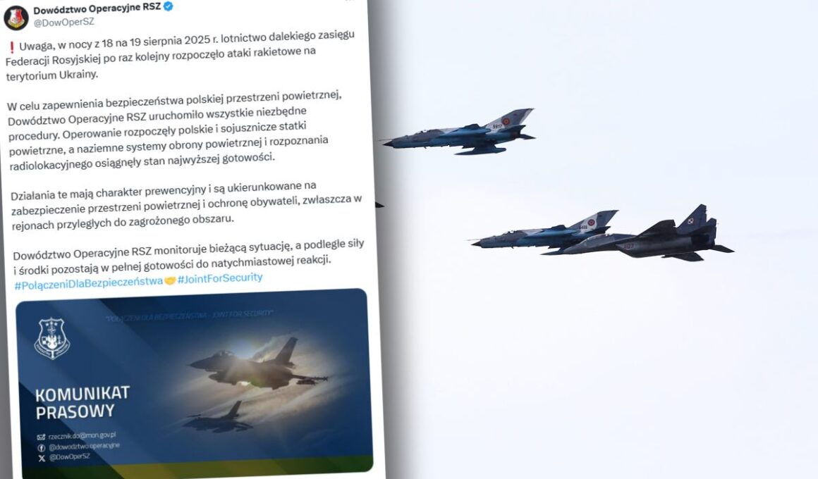 On Tuesday, August 19, the Polish Operational Command informed that on the night of August 18–19, Russian long‑range aviation launched further missile attacks on Ukraine. In order to ensure the safety of Polish air space, all necessary procedures were activated. Polish and allied aircraft along with ground‑based air defence and radar reconnaissance systems reached the highest state of readiness, as stated in the communique. The Command emphasized that these actions are preventive and aimed at securing airspace and protecting citizens, especially in areas adjacent to the threatened zone. Full monitoring and readiness for immediate response were assured.