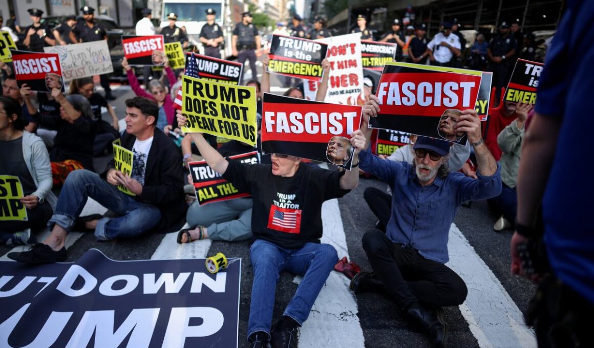 About 12 people sat on the ground near the intersection of 42nd Street and Second Avenue, blocking traffic, and holding banners with anti-Trump slogans such as “fascist,” “arrest Donald Trump,” and “Trump still lies.”