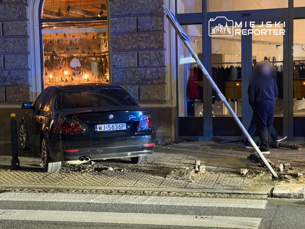 On Wednesday, 17 December 2025, in the evening on Marszałkowska Street near Zbawiciela Square in Warsaw’s Śródmieście, a BMW was involved in a traffic incident that damaged infrastructure and struck a building façade, causing temporary traffic disruptions.