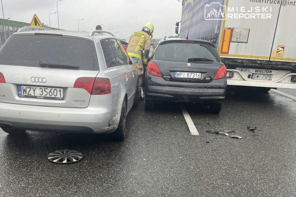 Two private automobiles and a truck collided on Poland’s S8 highway at Młochów and Żabieniec prior to 10:00 AM. Three vehicles comprising the crash occupied a large portion of the roadway.