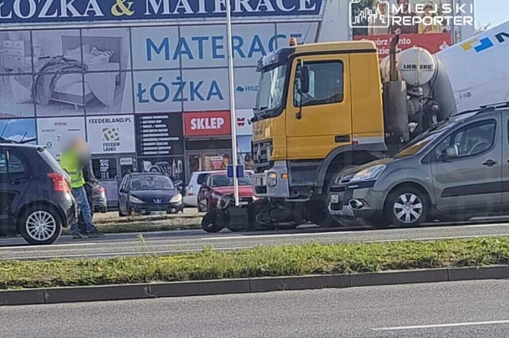 In the morning on Radzymińska Street in Ząbkach, near the intersection with Wolności Street, a concrete mixer of the ‘gruszka’ type struck a scooter, causing the rider to tumble onto the road. The collision occurred approximately 70 m before the intersection with Wolności.