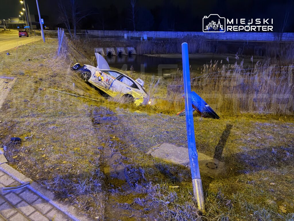 Two vehicles collided on Bemowo late Tuesday night, with one car transporting people driving into a retention tank.