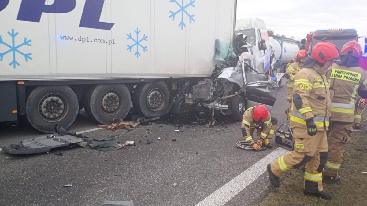 A collision on the A2 motorway near Holendry Baranowskie on 22 November forced a rescue helicopter to land, after a driver’s seat was crushed between a trailer and a truck beside a tow vehicle.