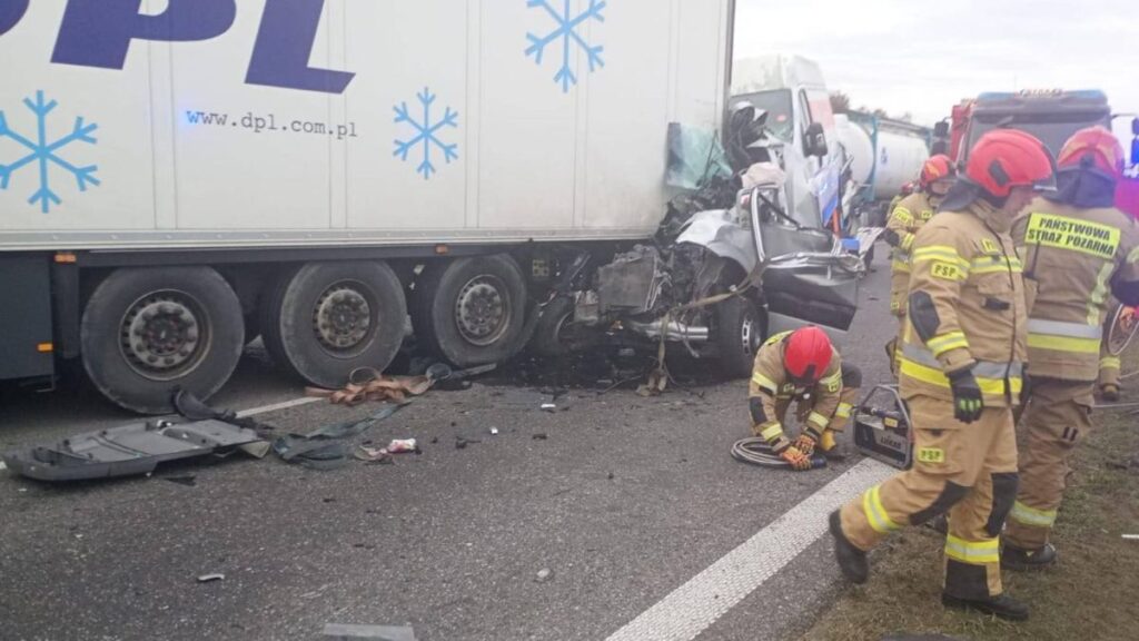 A collision on the A2 motorway near Holendry Baranowskie on 22 November forced a rescue helicopter to land, after a driver’s seat was crushed between a trailer and a truck beside a tow vehicle.