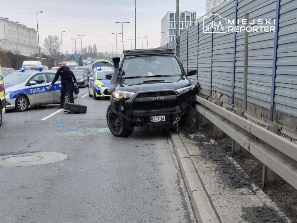 On February 10, before 11 o’clock, a collision occurred between a passenger Toyota and energy-absorbing barriers on Aleja Prymasa Tysiąclecia, before the intersection with Czorsztyńska Street, heading toward Ochota.