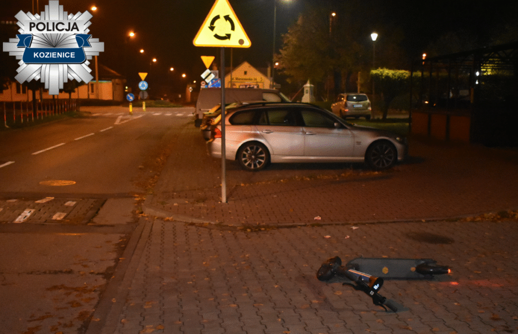 A 45‑year‑old man was injured after falling on a sidewalk while riding a scooter in Kozienice, Poland, on Sunday; a breath test revealed a 2.5‑per‑mille blood alcohol level, and he was taken to hospital.