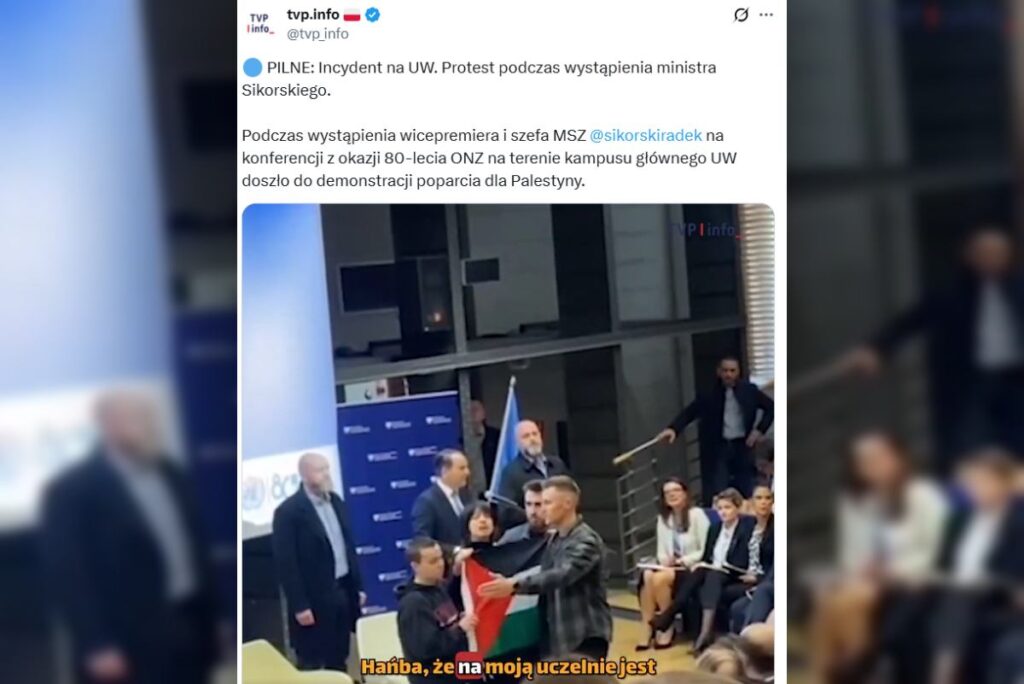 Radosław Sikorski, Deputy Prime Minister and Foreign Minister, spoke at a conference celebrating the United Nations’ 80th anniversary on the University of Warsaw campus. A student, holding a Palestinian flag, marched into the middle of the hall and accused him of supporting genocide, demanding an embargo and sanctions against Israel. Sikorski attempted to defuse the situation while security escorted the student out.