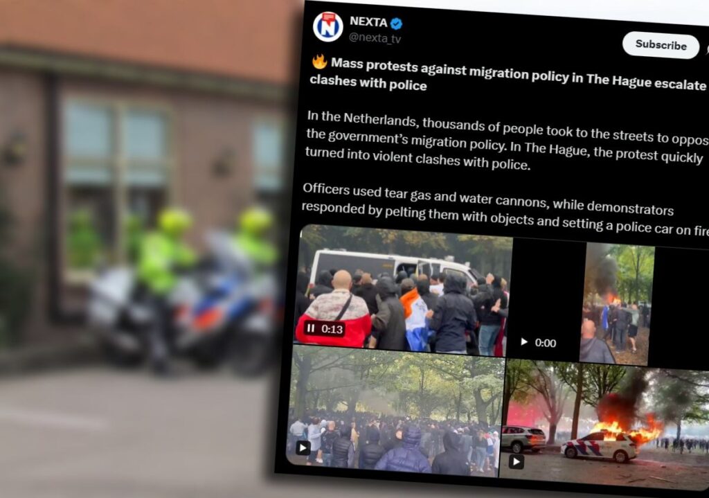 The anti-immigration demonstration in The Hague quickly turned into riots and clashes with police, with officers using tear gas and water cannons, and protesters throwing objects and setting fire to police cars.