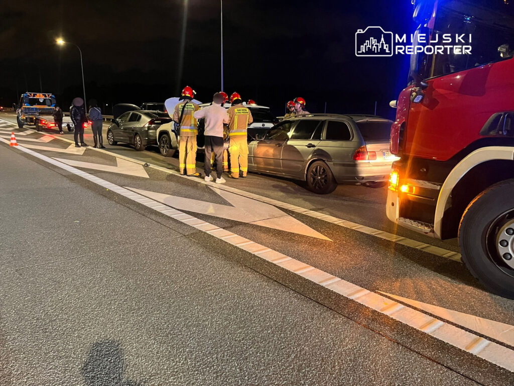 On the S7, coming from Radom, a BMW struck the rear of a Toyota, shoving the Toyota into a Honda that was ahead of it. The impact caused injuries to the BMW driver.