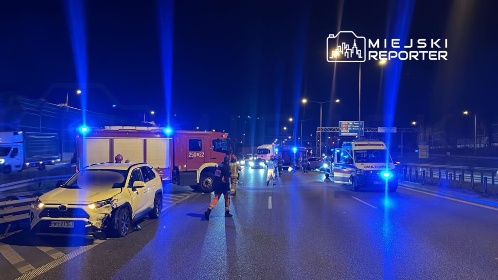 Three cars collided before a viaduct over Broniewskiego Street on Poland’s S8 motorway, blocking two lanes and causing significant traffic delays.