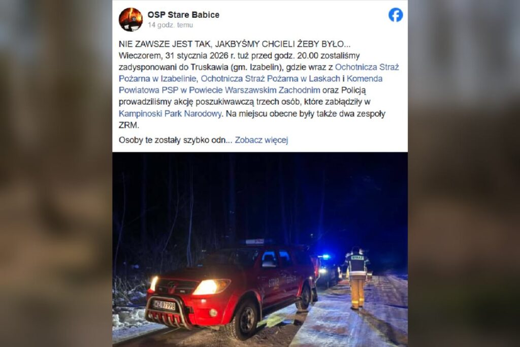 On Saturday, January 31, in the evening, services received a report about three tourists lost in Kampinos National Park. The 57-year-old woman, her 30-year-old daughter, and the 35-year-old partner of the younger woman had lost their way in the national park area. Police officers, firefighters, rescuers, and a guide with a tracking dog were on site. The fire department reported that the tourists were found between Truskaw and Pociecha. The older woman died. The 35-year-old and 30-year-old were taken to the hospital in a non-life-threatening condition.