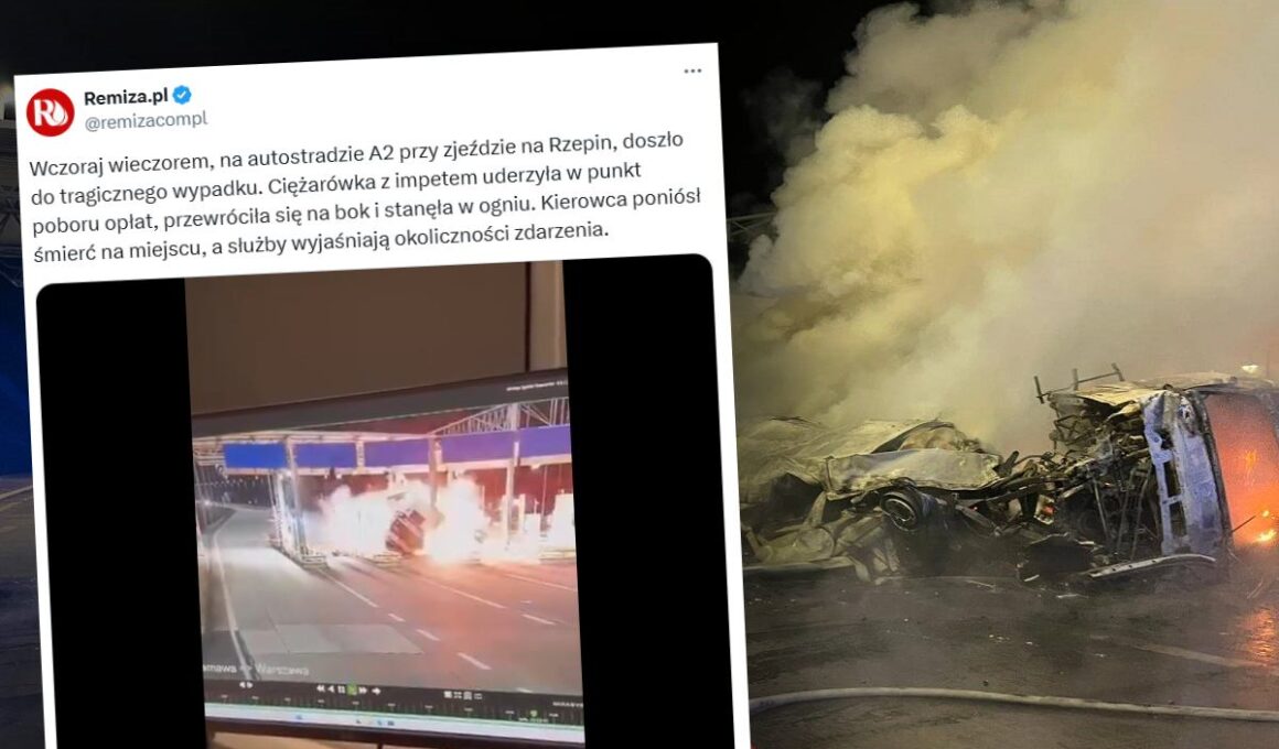 A heavy truck collided with a toll booth at the Tarnawa Toll Collection Point before 11 p.m. on Saturday (August 23). The vehicle immediately caught fire, and the driver died at the scene. Surveillance cameras recorded the moment of impact and the subsequent blaze, with a nearly 10-second clip published by Remiza.pl on its X account.
