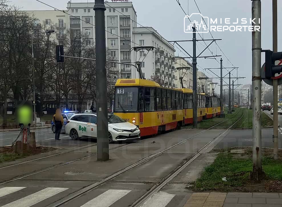 At around 9:55 a.m. on Puławska Street at the Dąbrowskiego intersection in Mokotów, a tram from line 18 collided with a Toyota passenger vehicle, halting tram traffic in the area.