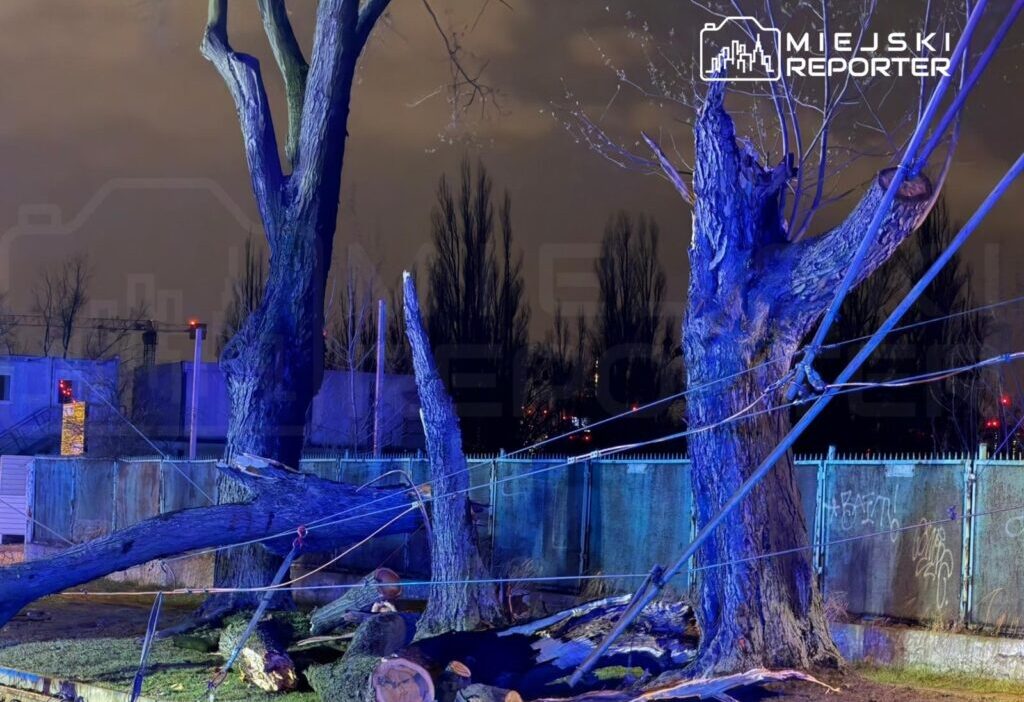 On April 5th, before 8 PM, strong winds during a storm caused two trees to fall and severely damage the tram power lines on Jagiellońska Street, near the former FSO factory. Firefighters and Warsaw Tramways technical services were dispatched to the scene, and tram traffic was suspended, replaced by bus service.