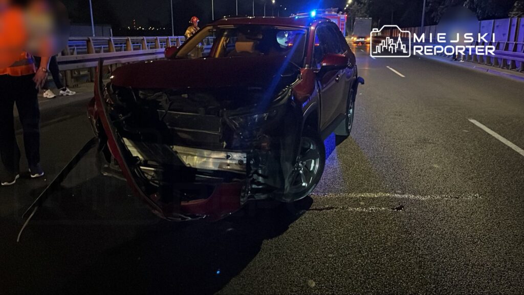 A truck and a sedan collided near the Pergaminów roundabout on Wisłostrada in Bielany yesterday evening while the truck driver was changing lanes, causing the car to hit elastic barriers. The truck driver’s sudden brakes caused a cargo shift that impacted the truck’s semi-tractor unit.