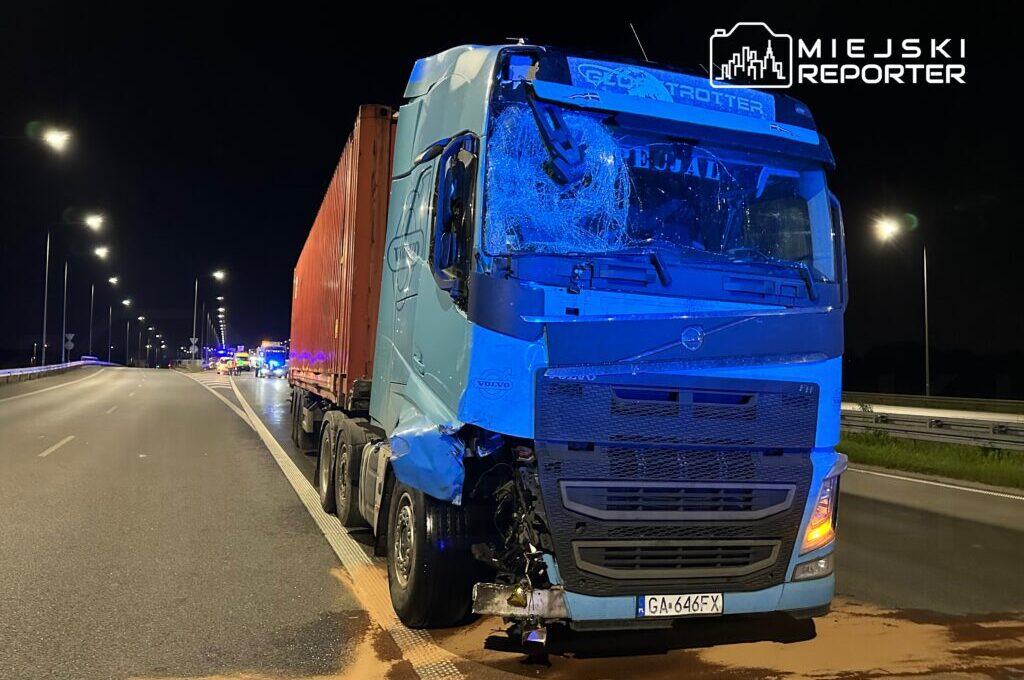 At night on the S2 highway near Wilanów, a Volvo truck driver fell asleep and crashed into a parked roadside trailer on Przyczółkowa Street, causing significant damage but no injuries.