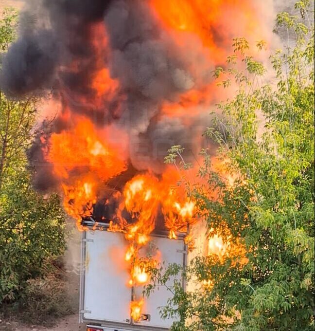 Upon arrival, firefighters encountered a fully developed fire. They deployed two water streams to combat the blaze. Inside the truck, several propane-butane gas cylinders were found, which were later removed and cooled to prevent further risks.
