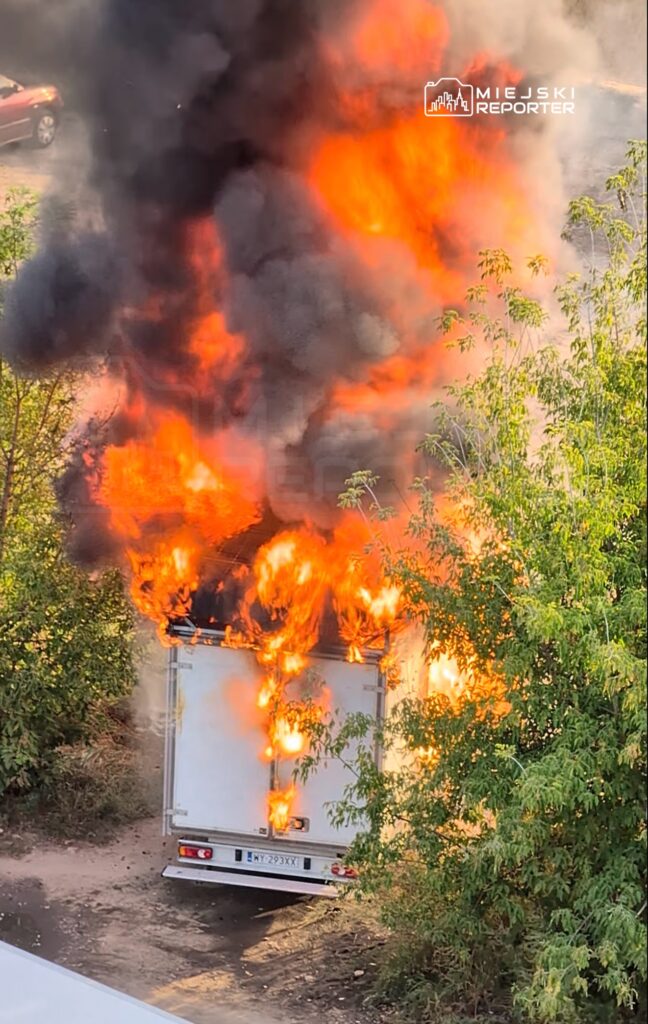 A Fiat delivery truck caught fire on Krzyżówki Street in Warsaw’s Białołęce district around 6:10 PM, engulfing the vehicle entirely and spreading flames to nearby grass and shrubs.