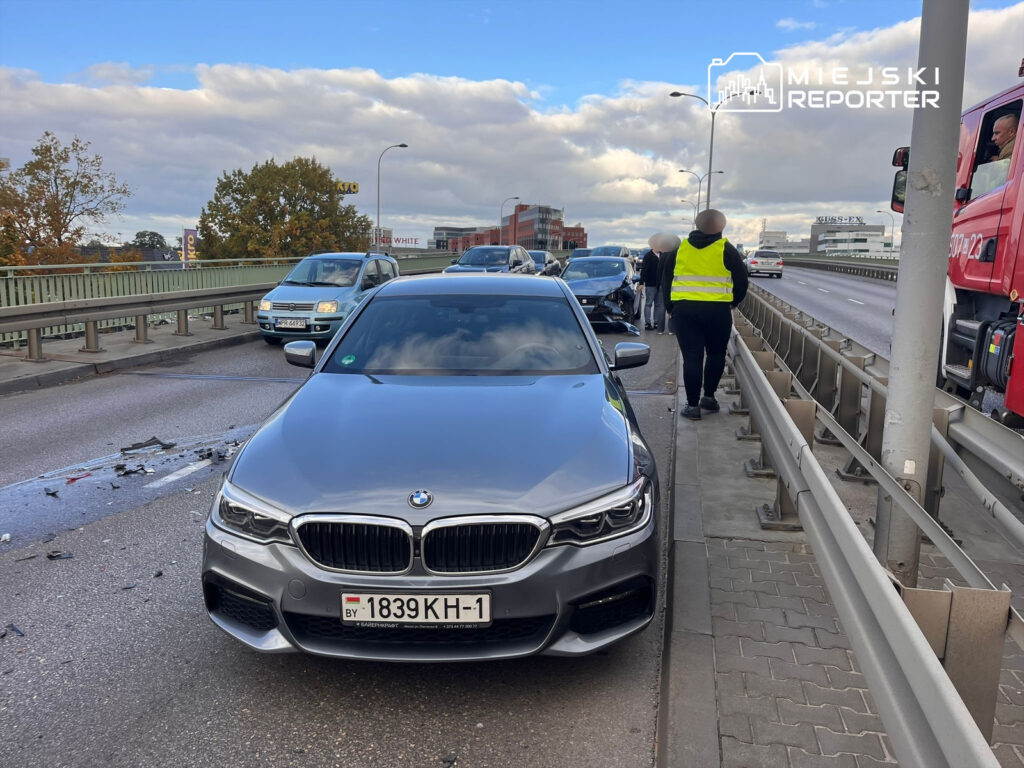 A collision between a Seat and a BMW on the Aleje Jerozolimskie viaduct near Popularna Street blocked traffic toward Pruszków and the city centre before 4:30 p.m. today.