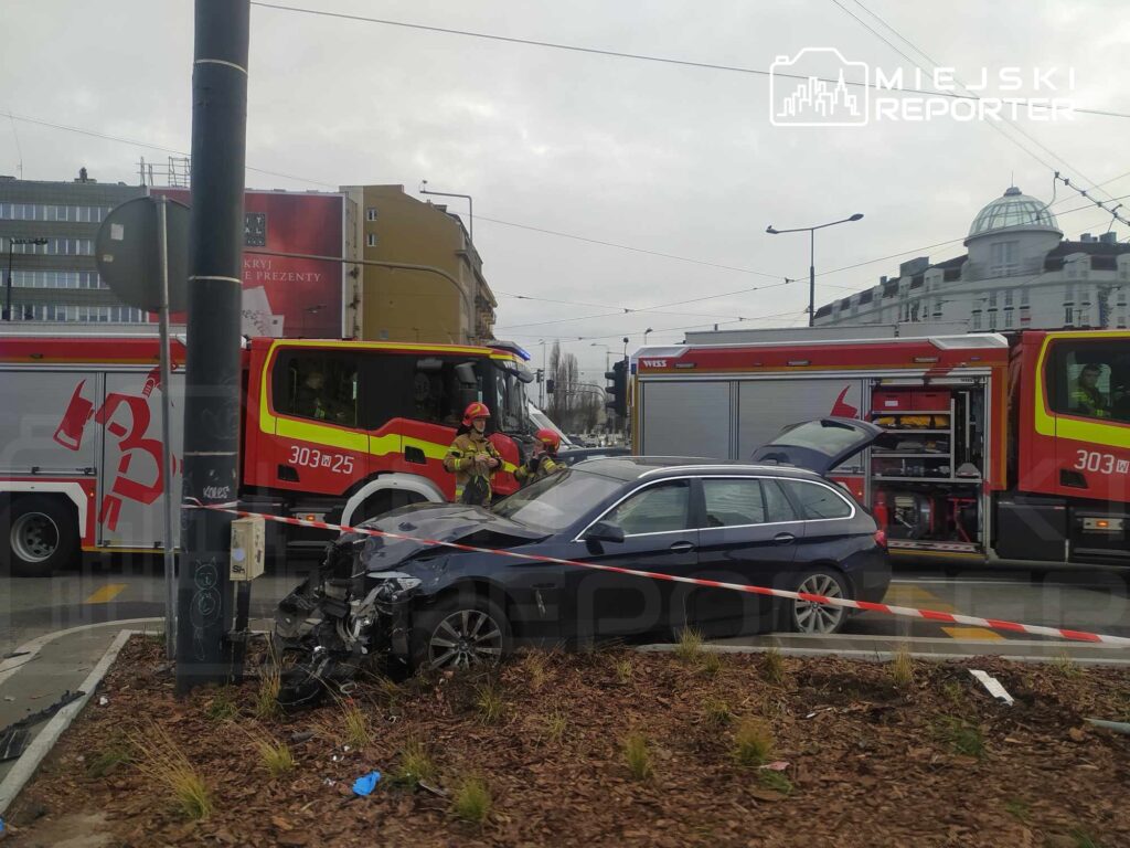 At 11:10 on Sunday, a Dacia and a BMW collided at Warsaw’s Zawisza Square in Ochota, with the Dacia crashing into a traffic light post and causing traffic delays.