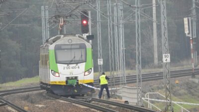 Road and rail traffic on Solidarności Avenue toward Wola is completely blocked; vehicles cannot pass the accident site until cleanup finishes.