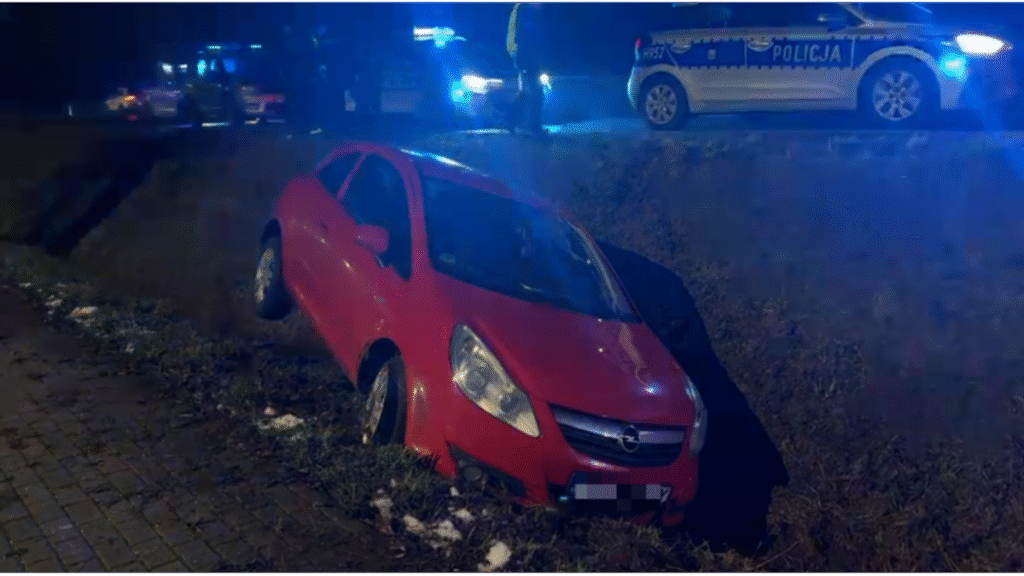 A 34‑year‑old Ukrainian stole an Opel Corsa left beside a parcel locker in Sochaczew, Poland, and fled, prompting police on road 92 to use a patrol car as a barrier and fire a warning shot.