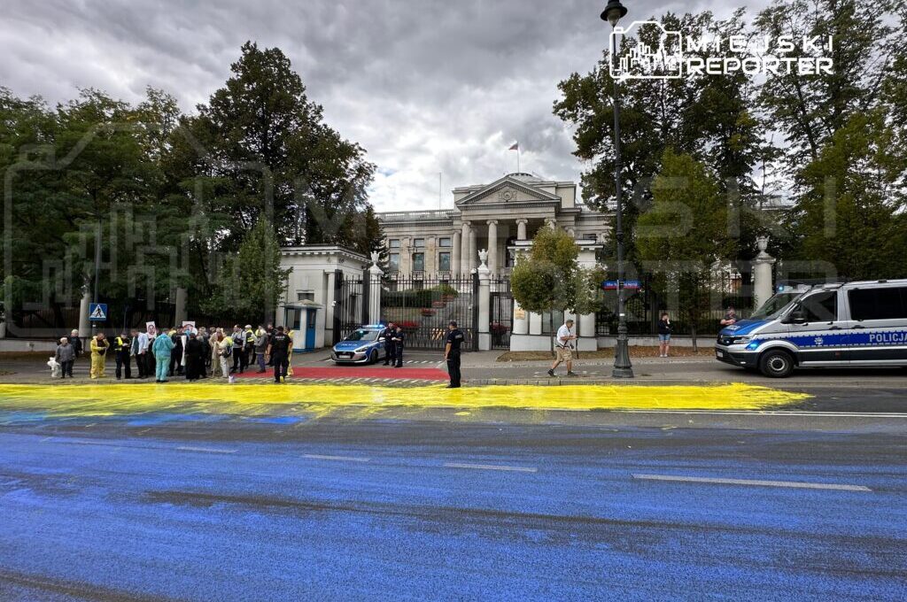 On Ukraine’s National Flag Day, August 23rd, a solidarity action took place in front of the Russian Embassy in Warsaw. Around 11:00 AM, dozens of people painted the Ukrainian flag on the asphalt near the Belweder Street building.