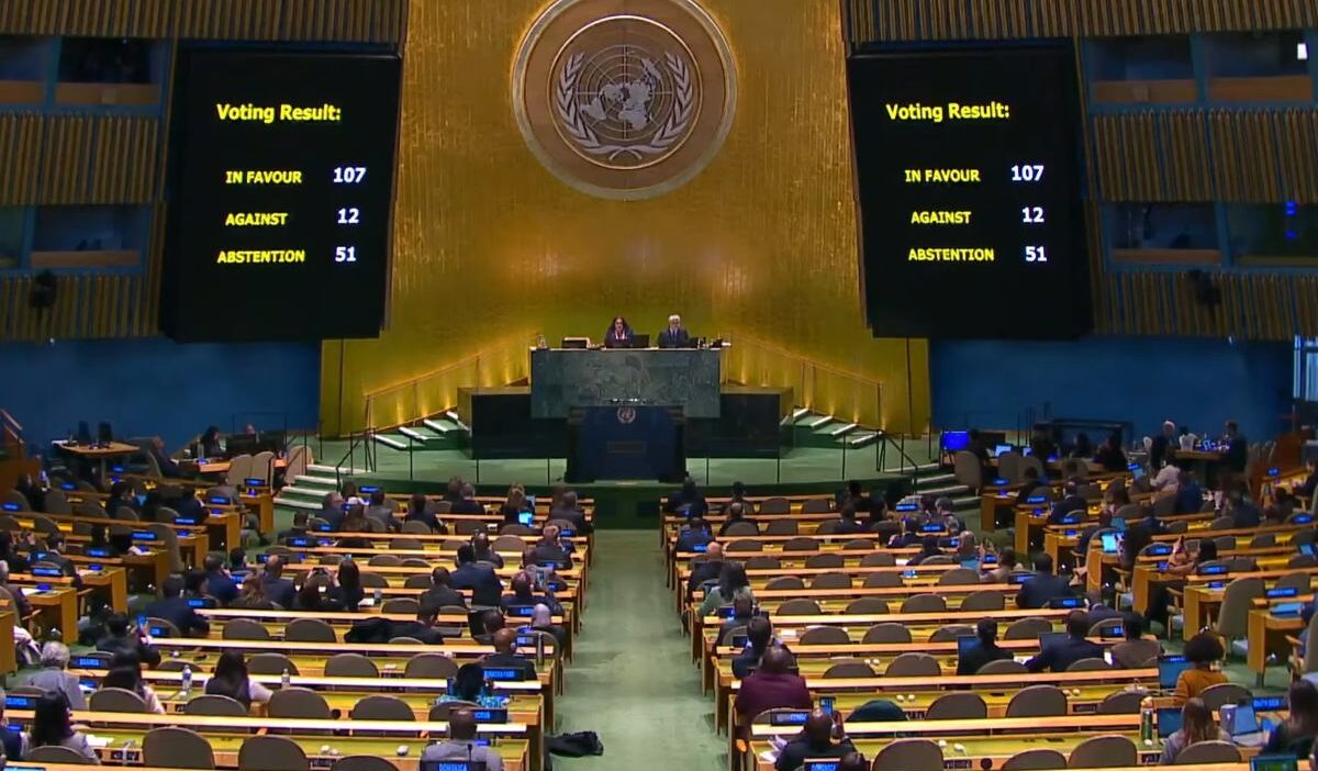 107 countries supported the resolution, 12 were against, and 51 abstained. Belarus and Russia voted against, while China, Hungary, Kazakhstan, Qatar, Serbia, and the United States abstained.