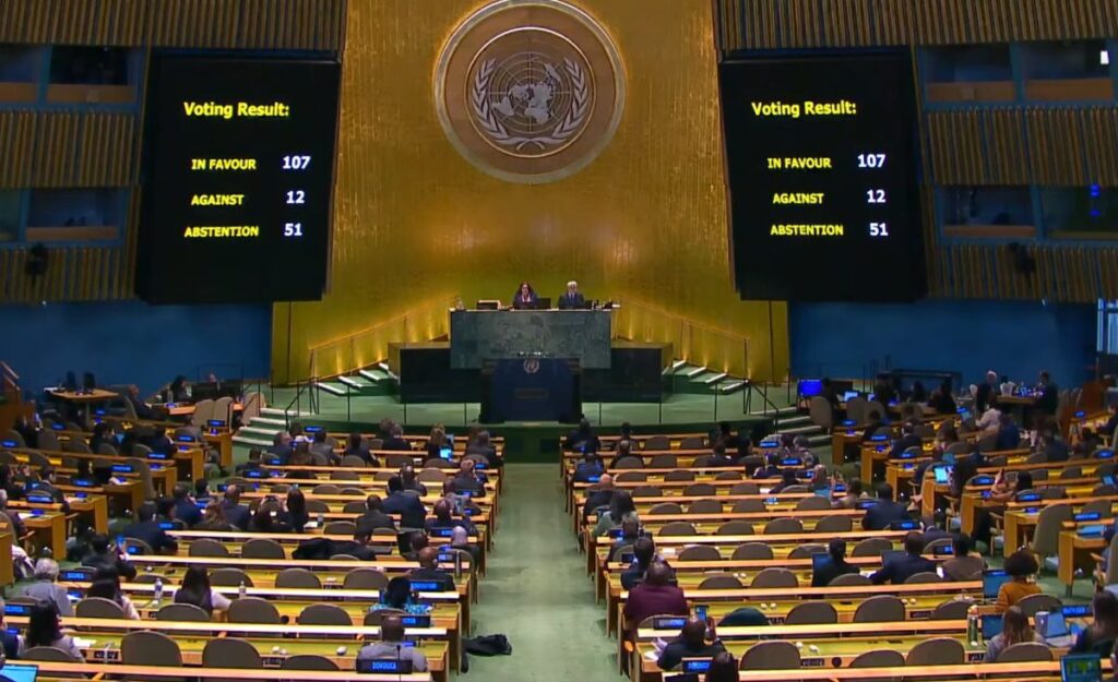 107 countries supported the resolution, 12 were against, and 51 abstained. Belarus and Russia voted against, while China, Hungary, Kazakhstan, Qatar, Serbia, and the United States abstained.