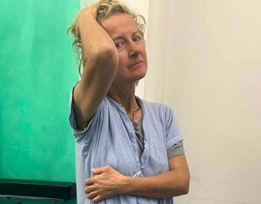 She appears to be around 45 years old, stands 168 cm tall, is slender, and has light, shoulder‑length hair. She speaks Polish fluently.