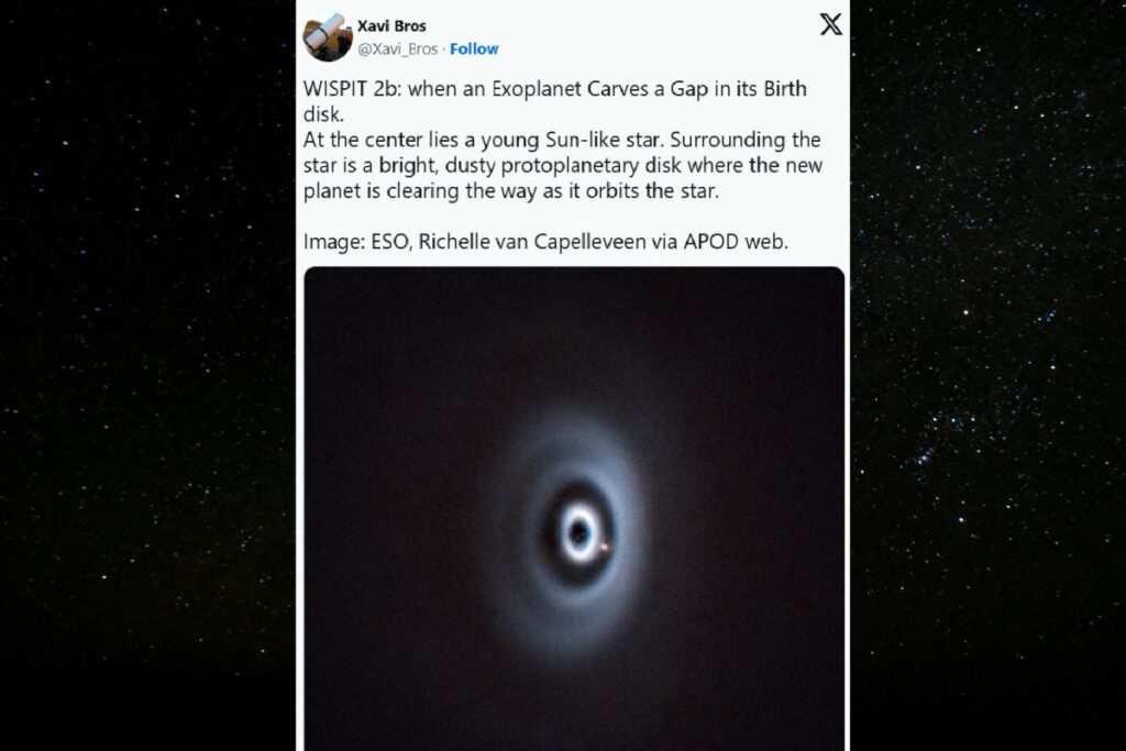 Researchers announced the detection of WISPIT 2b in “The Astrophysical Journal Letters.” The gas giant, comparable in size to Jupiter, orbits a star similar to the Sun and was observed at an extremely early stage of its evolution, estimated to be around five million years old.