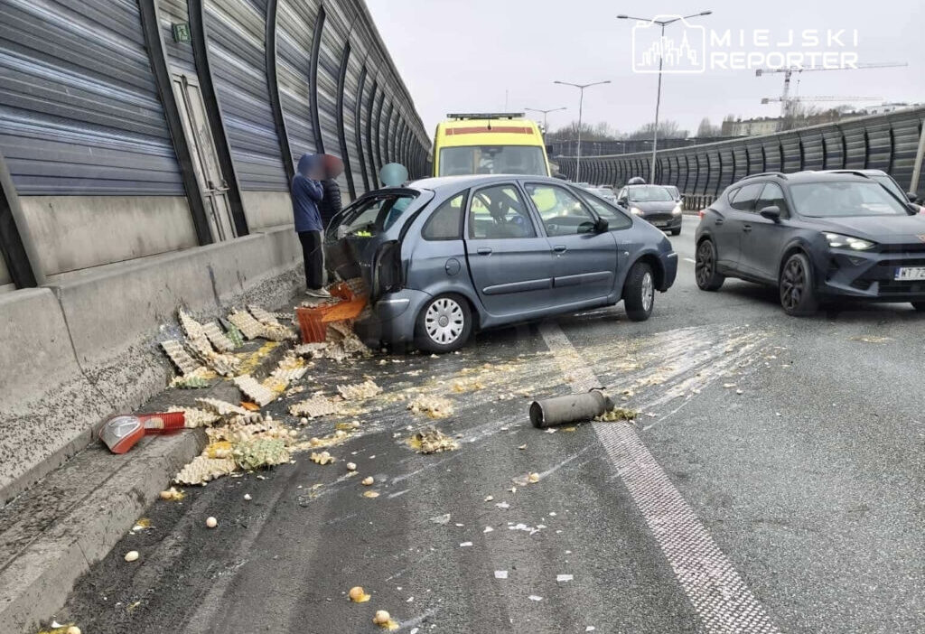 Two-car collision on S8 road spills hundreds of eggs, creating unusual traffic hazard.
