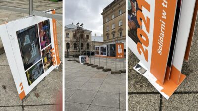 The Komitet Obrony Demokracji reported that most of the photo boards from the “10 Years KOD” exhibition on Literatów Square were ripped from their frames, with some shattered.