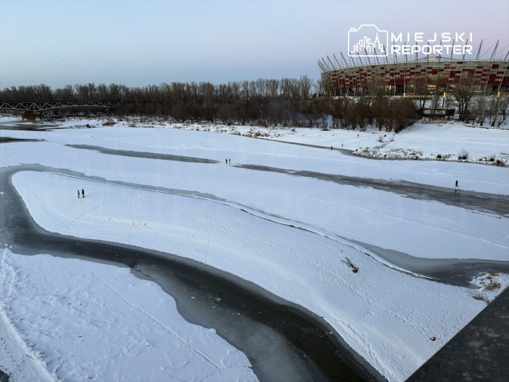 On Sunday, February 1, 2026, individuals were seen venturing onto the frozen river in the Warsaw section of the Vistula, particularly near the Poniatowski Bridge. Some daredevils walked toward sandy shoals beneath the bridge spans. Walking on river ice is extremely risky because the current remains active beneath the surface, and the ice on the Vistula can be uneven and collapse suddenly, even if it appears “solid” from the bank.