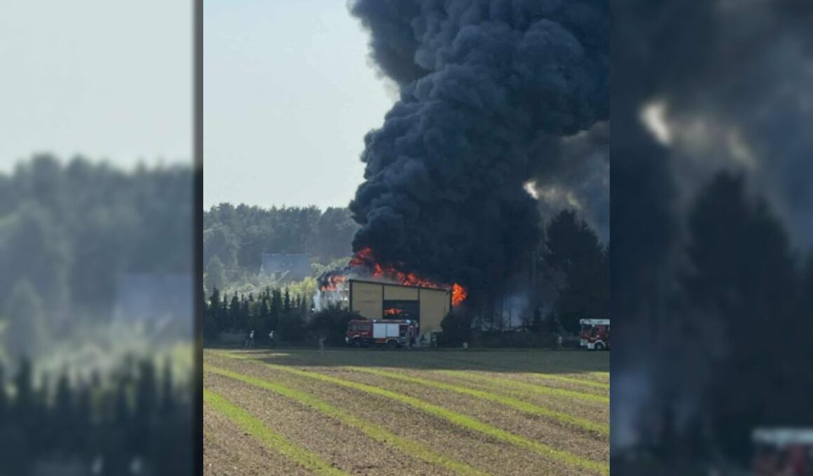 Fire erupted on Thursday, August 14, in production‑storage halls dealing with foil processing in the village of Siarzewo (Aleksandrowice County, Kuyavian‑Pomeranian Voivodeship). According to Interia, the blaze also engulfed two small outbuildings and a car parked in front of the building. Consequently, 25 firefighter teams were dispatched. Senior Lieutenant Przemysław Baniecki of the Toruń PSP brigade said the firefighting operation “may take at least a few more hours.”