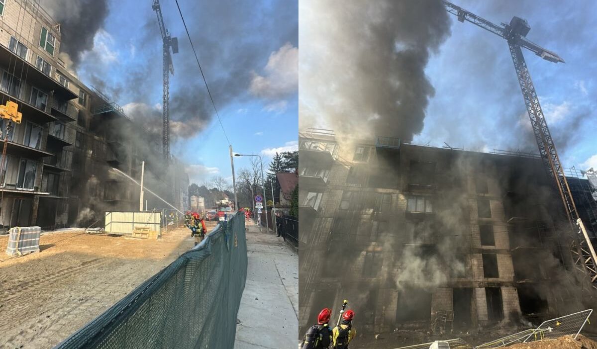 The Warsaw City State Fire Service received a report of a fire at a construction site located at 31 Laurowa Street around 1:00 PM. Upon arrival, firefighters confirmed a fire was burning on the building’s facade.