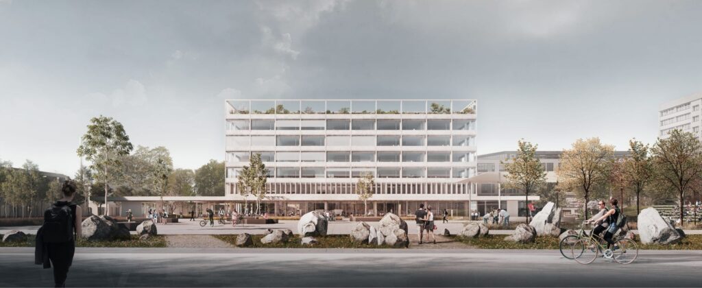 The 26,600 m² building includes a two-level auditorium, 30 classrooms, 20 research team modules, and a student service zone. It also features underground parking for 139 cars, 80 bike spots, a viewing terrace, and a rooftop garden. The structure uses geothermal heating and a 25 kW solar installation, aiming for a BREEAM “Very Good” sustainability rating.