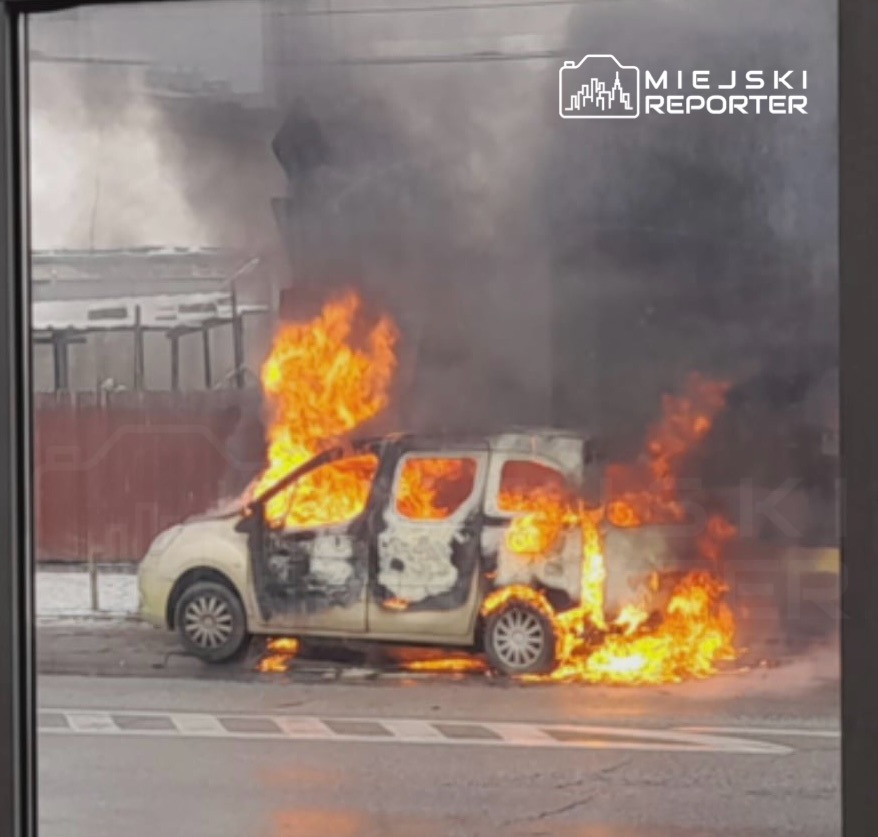At about 9 a.m., a passenger car ignited on Wspólna Street in the Wesoła district. The fire rapidly enveloped the entire vehicle, requiring a temporary blockade of the street to allow firefighting operations.